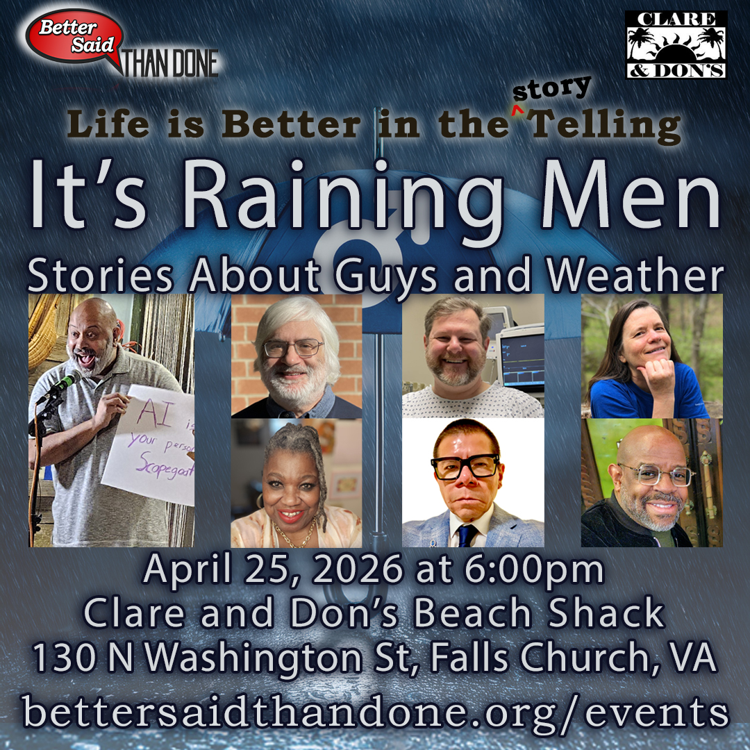 On April 25, join Better Said Than Done at Clare and Don’s Beach Shack for “It’s Raining Men: stories about guys and weather,” with emcee Ravi Pimplaskar and storytellers Len Kruger, Joe Morice, Sarah Snyder, Zette St. Charles, Carlos Velazquez, and Chris Wade.