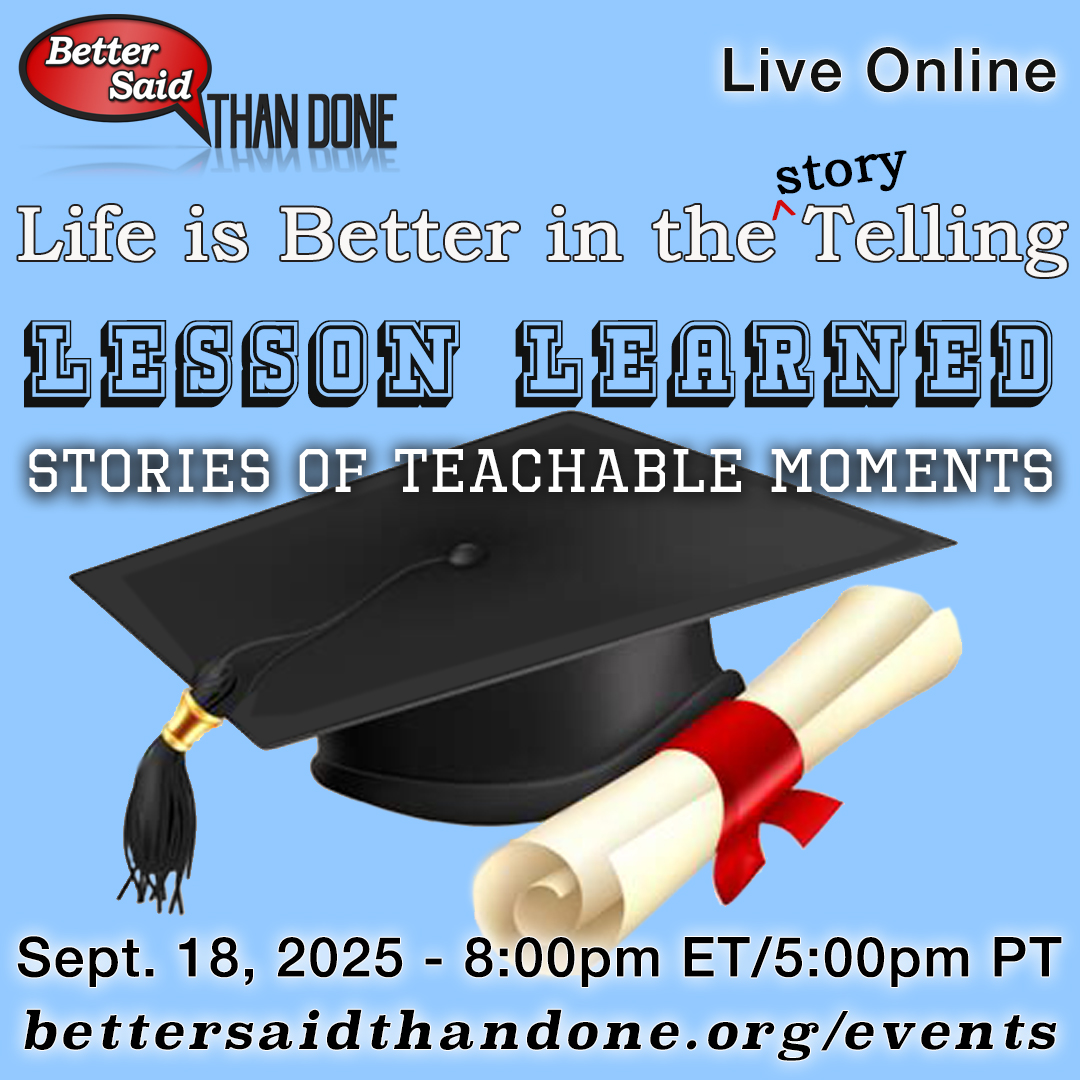 Better Said Than Done’s Hot and Spicy storytelling show, online. On July 10, 2025, join storytellers Vicki Bryan, Claire Hennessy, Jessica Robinson, Jude Treder-Wolff and Megan Wells, on Zoom, for Hot and Spicy Stories. $15 Suggested/$5 Minimum All Proceeds Split Between Producer and Storytellers If you miss it live on Zoom, you can watch the […]