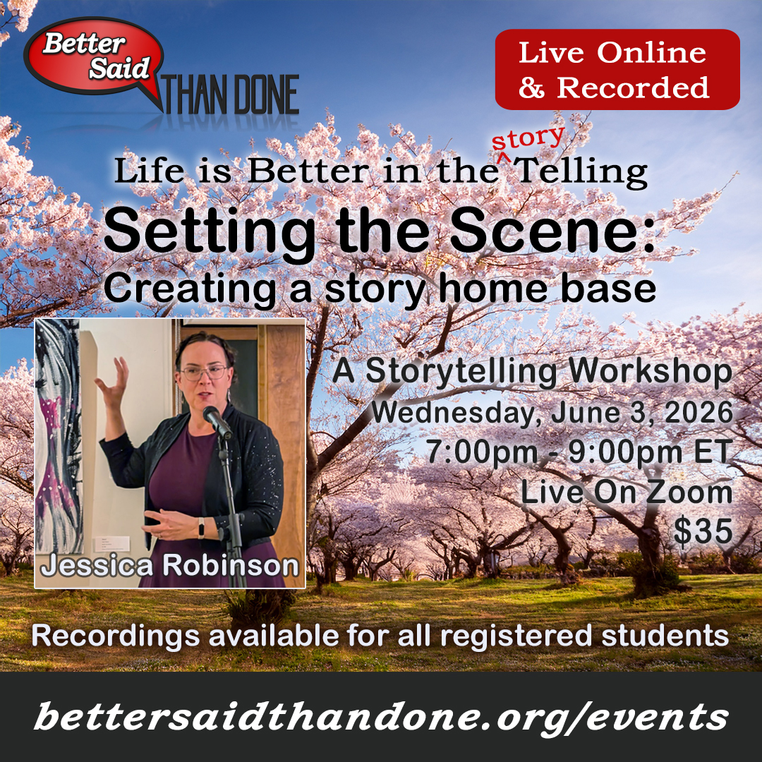 Join Better Said Than Done storytelling online this Spring for a series of storytelling workshops to nourish and grow your creative spirit. Workshops led by Better Said Than Done Executive Director Jessica Piscitelli Robinson. You can register on this page. April 29, 2026 – Workshop 1: Drama – what makes a story a story Learn […]