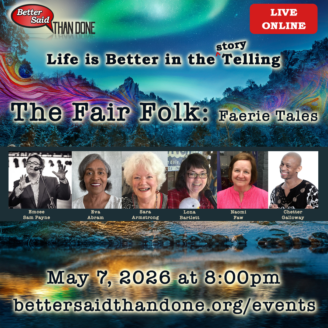 Join Better Said Than Done on Zoom on May 7, 2026 at 8:00pm Eastern for “The Fair Folk: faerie tales,” with emcee Sam Payne and storytellers Eva Abram, Sara Armstrong, Lona Bartlett, Naomi Faw, and Chetter Galloway.