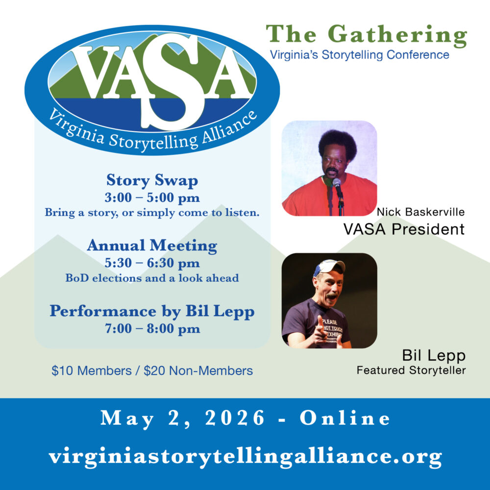 The Virginia Storytelling Alliance (VASA) annual Gathering is online for 2026, making it easier than ever for members across the state (and beyond) to join us for an afternoon and evening of stories, connection, and celebration.